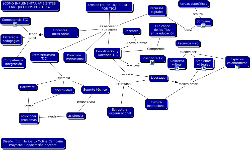 Este Cmap, tiene información relacionada con: AMBIENTES_TICS, Coordinación y Docencia TIC Apoya a otros Docentes, Soporte técnico proporciona asistencia, Infraestructura TIC ejemplo Hardware, Infraestructura TIC ejemplo Soporte técnico, Recursos digitales como Software, Dirección institucional Promueve Cultura institucional, solucionar problemas como Hardware, Liderazgo facilita crear Espacios colaborativos, AMBIENTES ENRIQUECIDOS POR TICS es necesario que exista Recursos digitales, Cultura institucional facilita crear Espacios colaborativos, Recursos web pueden ser Biblioteca vritual, Cultura institucional facilita crear Ambientes virtuales, Docentes otras Areas Deben tener Competencia Integración, Software realiza tareas especìficas, Recursos digitales como Recursos web, AMBIENTES ENRIQUECIDOS POR TICS es necesario que exista Docentes otras Areas, Coordinación y Docencia TIC necesita Liderazgo, solucionar problemas como Conectividad, Dirección institucional Promueve Estructura organizacional, Infraestructura TIC ejemplo Conectividad