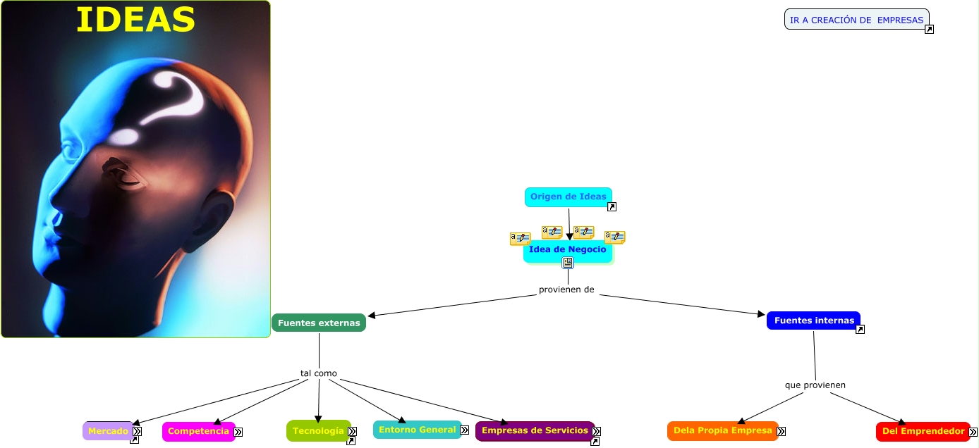 Este Cmap, tiene información relacionada con: Idea del Negocio, Fuentes externas tal como entorno gral., Fuentes internas que provienen De la propia empresa, Idea de Negocio provienen de Fuentes internas, Fuentes externas tal como tecnología, Fuentes internas ???? Fuentes internas, Fuentes externas tal como Empresas de Servicios, Origen de Ideas ???? Idea de Negocio, Empresas de Servicios ???? Empresas de Servicios, Fuentes externas tal como mercado, Mercado ???? ????, Fuentes externas tal como competencia, Idea de Negocio provienen de Fuentes externas, Tecnología ???? Tecnología, Fuentes internas que provienen Del emprendedor