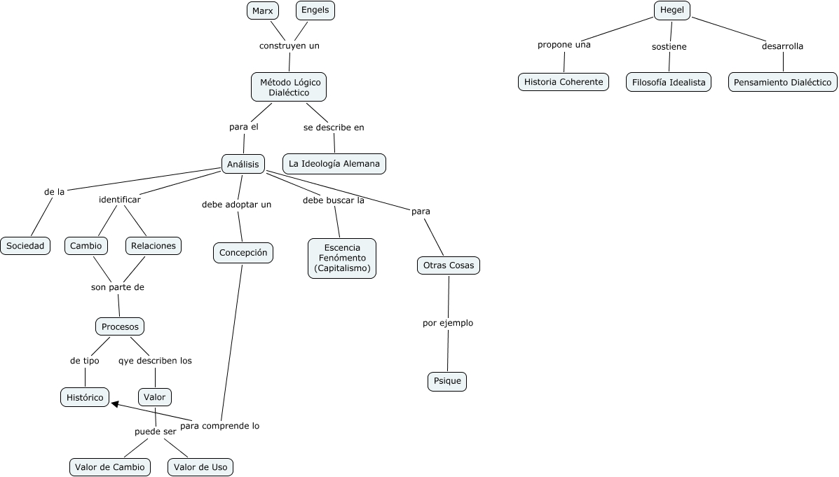 Este Cmap, tiene información relacionada con: Exposición de Holbrook sobre Método, Análisis de la Sociedad, Marx construyen un Método Lógico Dialéctico, Análisis para Otras Cosas, Hegel propone una Historia Coherente, Concepción para comprende lo Histórico, Análisis identificar Cambio, Procesos de tipo Histórico, Valor puede ser Valor de Uso, Análisis debe adoptar un Concepción, Hegel desarrolla Pensamiento Dialéctico, Engels construyen un Método Lógico Dialéctico, Análisis debe buscar la Escencia Fenómento (Capitalismo), Procesos qye describen los Valor, Valor puede ser Valor de Cambio, Otras Cosas por ejemplo Psique, Método Lógico Dialéctico se describe en La Ideología Alemana, Análisis identificar Relaciones, Método Lógico Dialéctico para el Análisis, Relaciones son parte de Procesos, Cambio son parte de Procesos