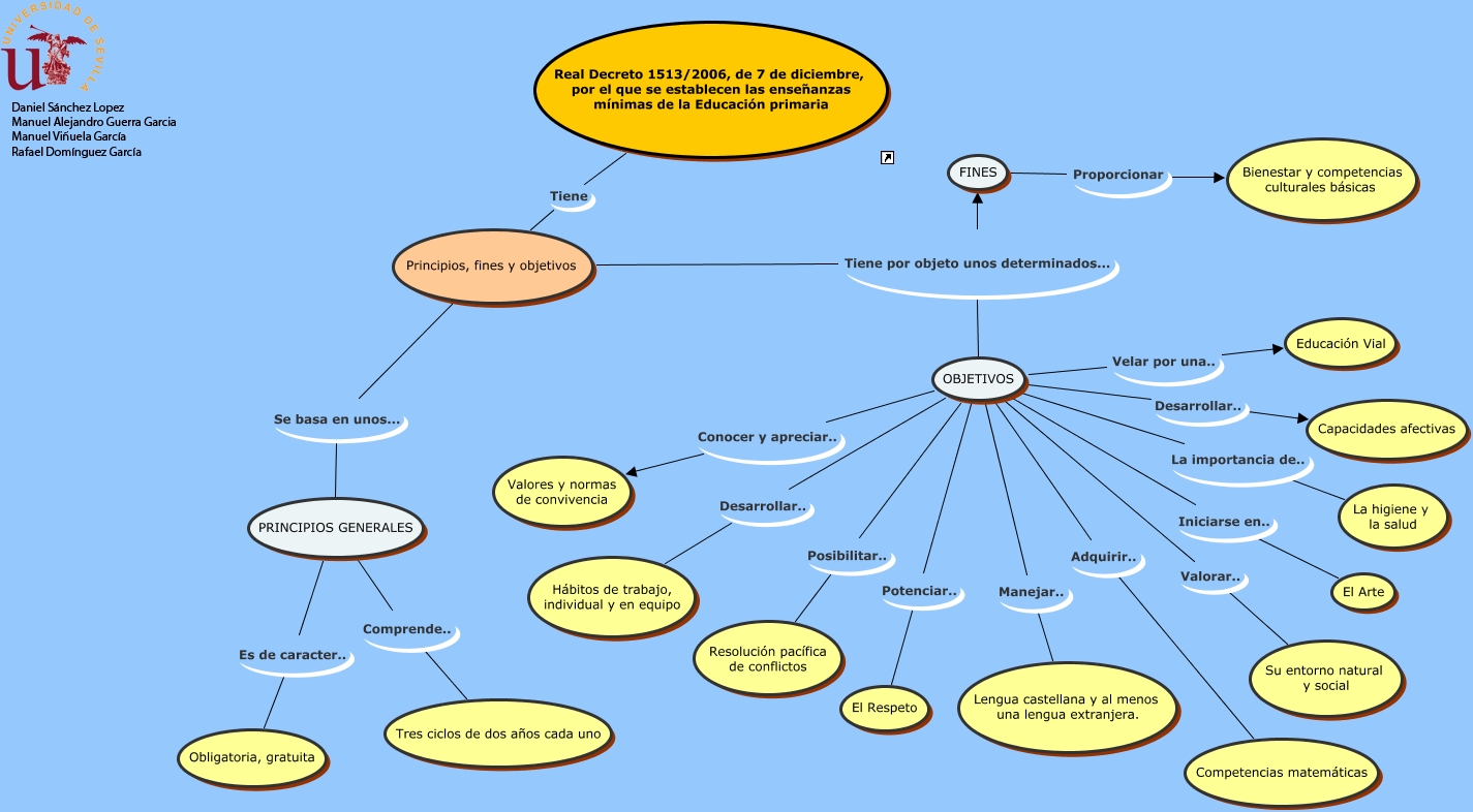 Este Cmap, tiene información relacionada con: Fundamentos, principios fines objetivos, OBJETIVOS Valorar.. Su entorno natural y social, OBJETIVOS Adquirir.. Competencias matemáticas, OBJETIVOS Velar por una.. Educación Vial, OBJETIVOS Potenciar.. El Respeto, Real Decreto 1513/2006, de 7 de diciembre, por el que se establecen las enseñanzas mínimas de la Educación primaria Tiene Principios, fines y objetivos, PRINCIPIOS GENERALES Comprende.. Tres ciclos de dos años cada uno, OBJETIVOS Desarrollar.. Hábitos de trabajo, individual y en equipo, PRINCIPIOS GENERALES Es de caracter.. Obligatoria, gratuita, OBJETIVOS Conocer y apreciar.. Valores y normas de convivencia, Principios, fines y objetivos Tiene por objeto unos determinados... OBJETIVOS, OBJETIVOS La importancia de.. La higiene y la salud, OBJETIVOS Desarrollar.. Capacidades afectivas, OBJETIVOS Posibilitar.. Resolución pacífica de conflictos, OBJETIVOS Iniciarse en.. El Arte, Principios, fines y objetivos Se basa en unos... PRINCIPIOS GENERALES, Principios, fines y objetivos Tiene por objeto unos determinados... FINES, FINES Proporcionar Bienestar y competencias culturales básicas, OBJETIVOS Manejar.. Lengua castellana y al menos una lengua extranjera.