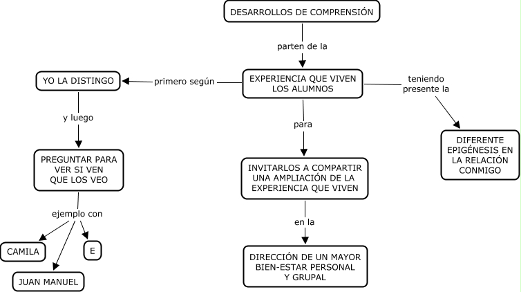Este Cmap, tiene información relacionada con: Desarrollos de comprensión, YO LA DISTINGO y luego PREGUNTAR PARA VER SI VEN QUE LOS VEO, EXPERIENCIA QUE VIVEN LOS ALUMNOS teniendo presente la DIFERENTE EPIGÉNESIS EN LA RELACIÓN CONMIGO, DESARROLLOS DE COMPRENSIÓN parten de la EXPERIENCIA QUE VIVEN LOS ALUMNOS, INVITARLOS A COMPARTIR UNA AMPLIACIÓN DE LA EXPERIENCIA QUE VIVEN en la DIRECCIÓN DE UN MAYOR BIEN-ESTAR PERSONAL Y GRUPAL, PREGUNTAR PARA VER SI VEN QUE LOS VEO ejemplo con JUAN MANUEL, EXPERIENCIA QUE VIVEN LOS ALUMNOS para INVITARLOS A COMPARTIR UNA AMPLIACIÓN DE LA EXPERIENCIA QUE VIVEN, PREGUNTAR PARA VER SI VEN QUE LOS VEO ejemplo con CAMILA, EXPERIENCIA QUE VIVEN LOS ALUMNOS primero según YO LA DISTINGO, PREGUNTAR PARA VER SI VEN QUE LOS VEO ejemplo con E