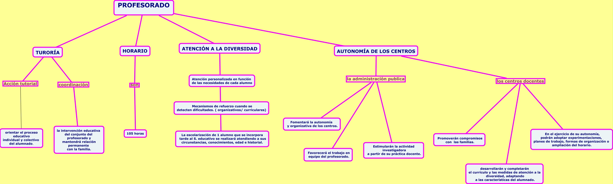Este Cmap, tiene información relacionada con: profesorado, AUTONOMÍA DE LOS CENTROS los centros docentes Promoverán compromisos con las familias., TURORÍA Acción tutorial orientar el proceso educativo individual y colectivo del alumnado., PROFESORADO ???? AUTONOMÍA DE LOS CENTROS, AUTONOMÍA DE LOS CENTROS la administración publica Estimularán la actividad investigadora a partir de su práctica docente., AUTONOMÍA DE LOS CENTROS la administración publica Fomentará la autonomía y organizativa de los centros., HORARIO son 105 horas, TURORÍA coordinación la intervención educativa del conjunto del profesorado y mantendrá relación permanente con la familia., ATENCIÓN A LA DIVERSIDAD ???? La escolarización de 1 alumno que se incorpora tarde al S. educativo se realizará atendiendo a sus circunstancias, conocimientos, edad e historial., AUTONOMÍA DE LOS CENTROS los centros docentes En el ejercicio de su autonomía, podrán adoptar experimentaciones, planes de trabajo, formas de organización o ampliación del horario., AUTONOMÍA DE LOS CENTROS la administración publica Favorecerá el trabajo en equipo del profesorado., PROFESORADO ???? HORARIO, TURORÍA ???? PROFESORADO, PROFESORADO ???? ATENCIÓN A LA DIVERSIDAD, AUTONOMÍA DE LOS CENTROS los centros docentes desarrollarán y completarán el currículo y las medidas de atención a la diversidad, adaptando a las características del alumnado.