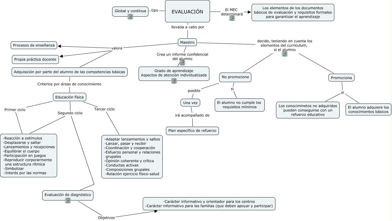 Este Cmap, tiene información relacionada con: evaluación, Adquisición por parte del alumno de las competencias básicas Criterios por áreas de conocimiento Educación física, Educación física Primer ciclo -Reacción a estímulos -Desplazarse y saltar -Lanzamientos y recepciones -Equilibrar el cuerpo -Participación en juegos -Reproducir corporarmente una estructura rítmica -Simbolizar -Interés por las normas, EVALUACIÓN El MEC determinará Los elementos de los documentos básicos de evaluación y requisitos formales para garantizar el aprendizaje, Evaluación de diagnóstico Objetivos -Carácter informativo y orientador para los centros -Carácter informativo para las familias (que deben apoyar y participar), EVALUACIÓN tipo Global y contínua, Maestro valora Adquisición por parte del alumno de las competencias básicas, Maestro decide, teniendo en cuenta los elementos del curriculum, si el alumno No promociona, EVALUACIÓN llevada a cabo por Maestro, Maestro decide, teniendo en cuenta los elementos del curriculum, si el alumno Promociona, Maestro Crea un informe confidencial del alumno Grado de aprendizaje Aspectos de atención individualizada, Educación física Segundo ciclo Evaluación de diagnóstico, Una vez irá acompañado de Plan especifico de refuerzo, No promociona posible Una vez, Maestro valora Propia práctica docente, Promociona si El alumno adquiere los conocimientos básicos, Promociona si Los conociminetos no adquiridos pueden conseguirse con un refuerzo educativo, Maestro valora Procesos de enseñanza, No promociona si El alumno no cumple los requisitos mínimos, Educación física Tercer ciclo -Adaptar lanzamientos y saltos -Lanzar, pasar y recibir -Coordinación y cooperación -Esfuerzo personal y relaciones grupales -Opinión coherente y crítica -Conductas activas -Composiciones grupales -Relación ejercicio físico-salud, Educación física Segundo ciclo -Reacción a estímulos -Desplazarse y saltar -Lanzamientos y recepciones -Equilibrar el cuerpo -Participación en juegos -Reproducir corporarmente una estructura rítmica -Simbolizar -Interés por las normas