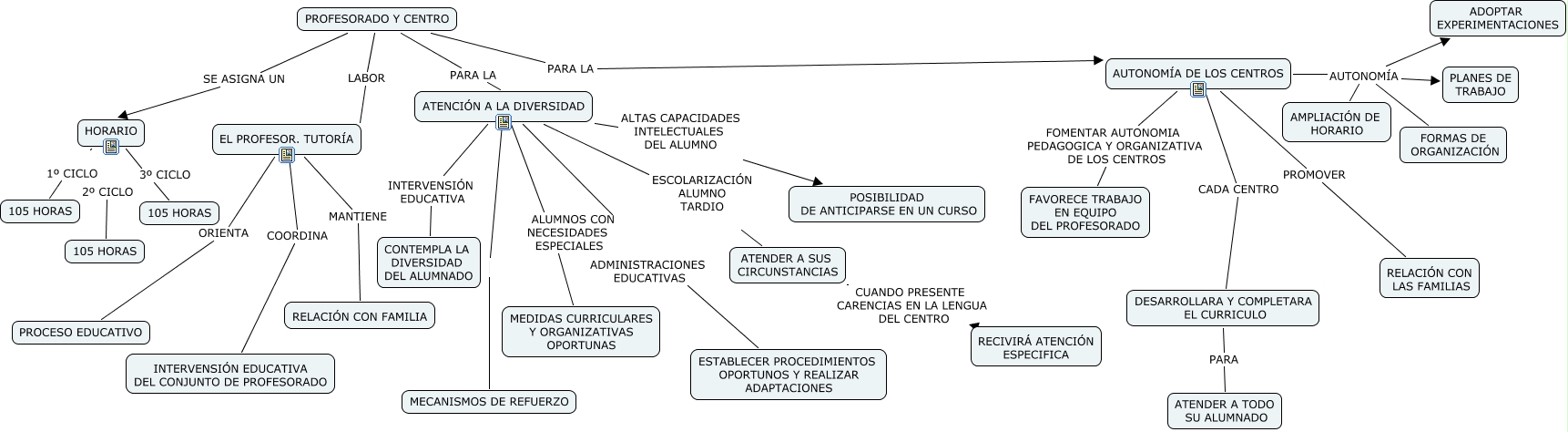 Este Cmap, tiene información relacionada con: Profesorado y centro, DESARROLLARA Y COMPLETARA EL CURRICULO PARA ATENDER A TODO SU ALUMNADO, AUTONOMÍA DE LOS CENTROS AUTONOMÍA FORMAS DE ORGANIZACIÓN, AUTONOMÍA DE LOS CENTROS AUTONOMÍA PLANES DE TRABAJO, HORARIO 3º CICLO 105 HORAS, PROFESORADO Y CENTRO SE ASIGNA UN HORARIO, ATENCIÓN A LA DIVERSIDAD ALTAS CAPACIDADES INTELECTUALES DEL ALUMNO POSIBILIDAD DE ANTICIPARSE EN UN CURSO, PROFESORADO Y CENTRO PARA LA AUTONOMÍA DE LOS CENTROS, AUTONOMÍA DE LOS CENTROS AUTONOMÍA AMPLIACIÓN DE HORARIO, AUTONOMÍA DE LOS CENTROS PROMOVER RELACIÓN CON LAS FAMILIAS, ATENCIÓN A LA DIVERSIDAD INTERVENSIÓN EDUCATIVA CONTEMPLA LA DIVERSIDAD DEL ALUMNADO, EL PROFESOR. TUTORÍA COORDINA INTERVENSIÓN EDUCATIVA DEL CONJUNTO DE PROFESORADO, EL PROFESOR. TUTORÍA MANTIENE RELACIÓN CON FAMILIA, ATENCIÓN A LA DIVERSIDAD ALUMNOS CON NECESIDADES ESPECIALES MEDIDAS CURRICULARES Y ORGANIZATIVAS OPORTUNAS, AUTONOMÍA DE LOS CENTROS AUTONOMÍA ADOPTAR EXPERIMENTACIONES, HORARIO 2º CICLO 105 HORAS, ATENCIÓN A LA DIVERSIDAD ESCOLARIZACIÓN ALUMNO TARDIO ATENDER A SUS CIRCUNSTANCIAS, PROFESORADO Y CENTRO LABOR EL PROFESOR. TUTORÍA, ATENCIÓN A LA DIVERSIDAD ADMINISTRACIONES EDUCATIVAS ESTABLECER PROCEDIMIENTOS OPORTUNOS Y REALIZAR ADAPTACIONES, ATENCIÓN A LA DIVERSIDAD MECANISMOS DE REFUERZO, HORARIO 1º CICLO 105 HORAS