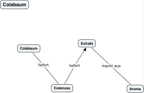 Dieses mit IHMC CmapTools erstellte CMap hat Informationen bezüglich: colabaum, Colanuss liefert Extrakt, Colabaum liefert Colanuss, Extrakt macht aus Aroma