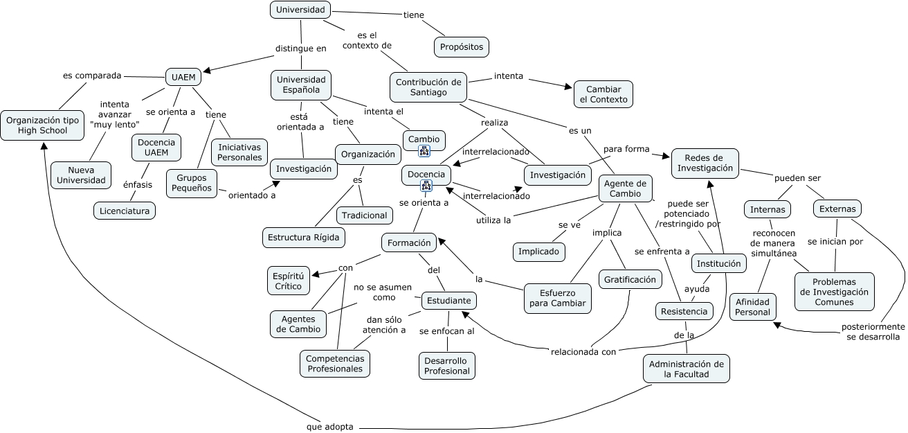 Este Cmap, tiene información relacionada con: Universidad, Administración de la Facultad que adopta Organización tipo High School, Institución ayuda Resistencia, Esfuerzo para Cambiar la Formación, Formación con Espíritú Crítico, Universidad Española intenta el Cambio, Estudiante dan sólo atención a Competencias Profesionales, Estudiante no se asumen como Agentes de Cambio, Investigación interrelacionado Docencia, UAEM tiene Iniciativas Personales, Contribución de Santiago intenta Cambiar el Contexto, Universidad Española está orientada a Investigación, Internas reconocen de manera simultánea Problemas de Investigación Comunes, Agente de Cambio implica Esfuerzo para Cambiar, Docencia interrelacionado Investigación, UAEM se orienta a Docencia UAEM, Contribución de Santiago realiza Docencia, Contribución de Santiago realiza Investigación, Redes de Investigación pueden ser Externas, Organización es Estructura Rígida, Docencia se orienta a Formación
