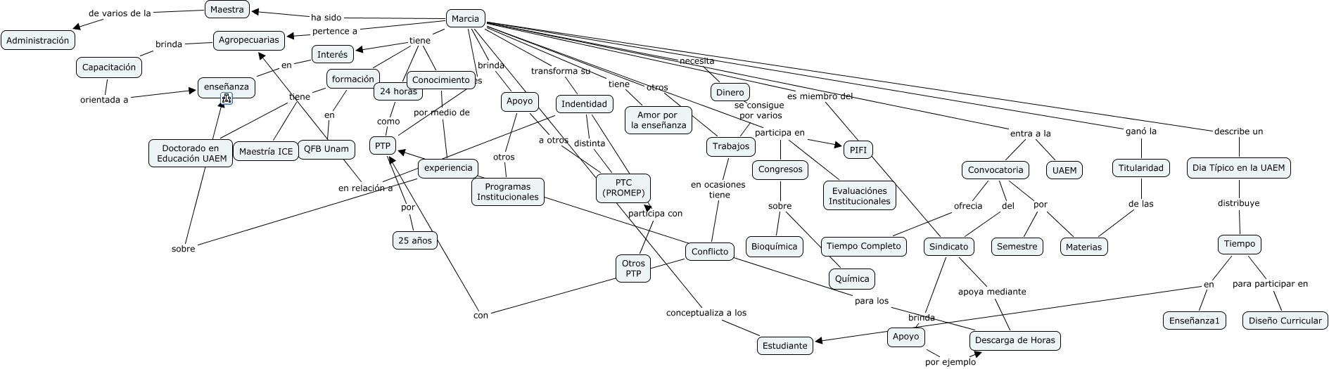 Este Cmap, tiene información relacionada con: Marcia, Descarga de Horas para los PTP, Marcia ha sido Maestra, Agropecuarias brinda Capacitación, Marcia transforma su Indentidad, Marcia tiene 24 horas, Indentidad distinta PTC (PROMEP), Marcia participa en PIFI, Marcia brinda Apoyo, Marcia otros Trabajos, Marcia tiene Amor por la enseñanza, Apoyo a otros PTC (PROMEP), formación tiene Doctorado en Educación UAEM, formación tiene Maestría ICE, Marcia ganó la Titularidad, Titularidad de las Materias, Maestra de varios de la Administración, Congresos sobre Química, Conocimiento por medio de experiencia, Tiempo para participar en Diseño Curricular, Marcia tiene Interés