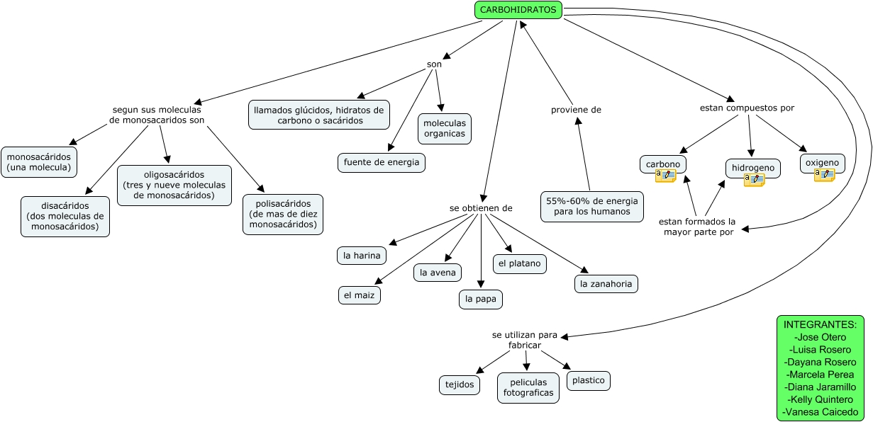 Este Cmap, tiene información relacionada con: CARBOHIDRATOS, CARBOHIDRATOS estan compuestos por carbono, CARBOHIDRATOS son llamados glúcidos, hidratos de carbono o sacáridos, CARBOHIDRATOS se utilizan para fabricar plastico, CARBOHIDRATOS estan formados la mayor parte por carbono, CARBOHIDRATOS se obtienen de la avena, 55%-60% de energia para los humanos proviene de CARBOHIDRATOS, CARBOHIDRATOS se utilizan para fabricar tejidos, CARBOHIDRATOS se obtienen de el platano, CARBOHIDRATOS estan compuestos por oxigeno, CARBOHIDRATOS son moleculas organicas, CARBOHIDRATOS segun sus moleculas de monosacaridos son oligosacáridos (tres y nueve moleculas de monosacáridos), CARBOHIDRATOS segun sus moleculas de monosacaridos son disacáridos (dos moleculas de monosacáridos), CARBOHIDRATOS se obtienen de el maiz, CARBOHIDRATOS son fuente de energia, CARBOHIDRATOS segun sus moleculas de monosacaridos son polisacáridos (de mas de diez monosacáridos), CARBOHIDRATOS se obtienen de la harina, CARBOHIDRATOS estan compuestos por hidrogeno, CARBOHIDRATOS estan formados la mayor parte por hidrogeno, CARBOHIDRATOS se obtienen de la zanahoria, CARBOHIDRATOS se utilizan para fabricar peliculas fotograficas