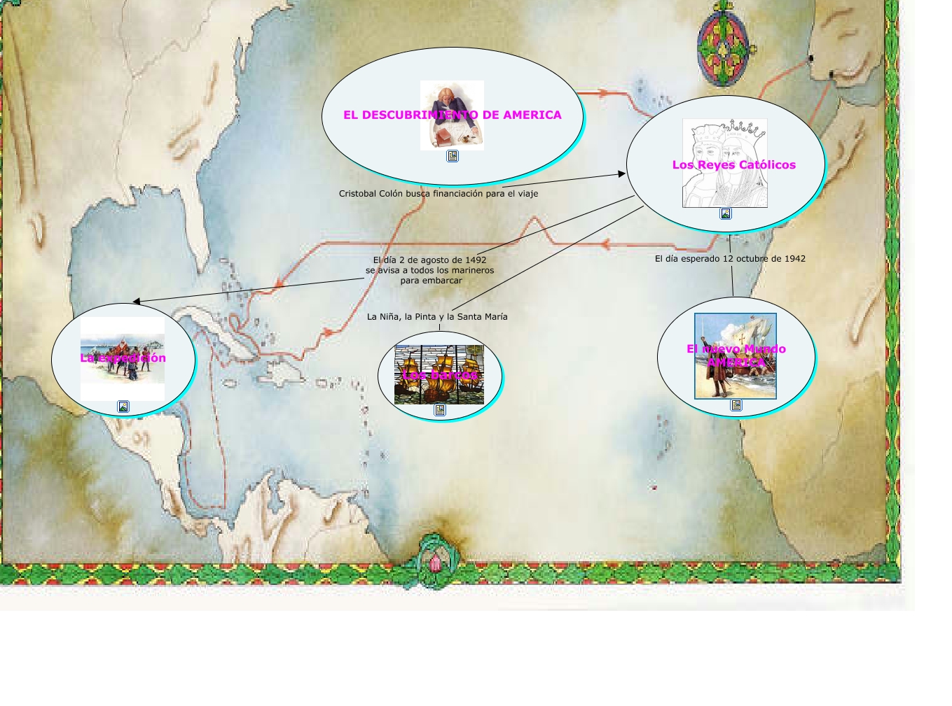 Este Cmap, tiene información relacionada con: El descubrimiento de América, Los Reyes Católicos El día 2 de agosto de 1492 se avisa a todos los marineros para embarcar La expedición, Los Reyes Católicos La Niña, la Pinta y la Santa María Los barcos, Los Reyes Católicos El día esperado 12 octubre de 1942 El nuevo Mundo AMERICA, EL DESCUBRIMIENTO DE AMERICA Cristobal Colón busca financiación para el viaje Los Reyes Católicos