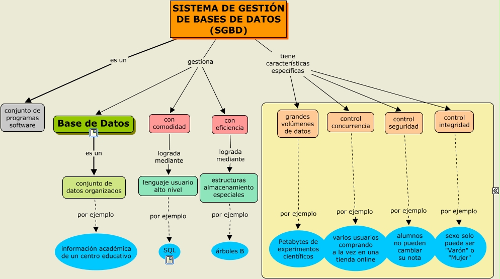 Este Cmap, tiene información relacionada con: Tarea 2 icetic44 - Sistemas de Gestión de Bases de Datos, SISTEMA DE GESTIÓN DE BASES DE DATOS (SGBD) tiene características específicas control seguridad, control integridad por ejemplo sexo solo puede ser "Varón" o "Mujer", grandes volúmenes de datos por ejemplo Petabytes de experimentos científicos, SISTEMA DE GESTIÓN DE BASES DE DATOS (SGBD) gestiona con eficiencia, control concurrencia por ejemplo varios usuarios comprando a la vez en una tienda online, con comodidad lograda mediante lenguaje usuario alto nivel, con eficiencia lograda mediante estructuras almacenamiento especiales, SISTEMA DE GESTIÓN DE BASES DE DATOS (SGBD) es un conjunto de programas software, SISTEMA DE GESTIÓN DE BASES DE DATOS (SGBD) gestiona Base de Datos, control seguridad por ejemplo alumnos no pueden cambiar su nota, conjunto de datos organizados por ejemplo información académica de un centro educativo, Base de Datos es un conjunto de datos organizados, estructuras almacenamiento especiales por ejemplo árboles B, SISTEMA DE GESTIÓN DE BASES DE DATOS (SGBD) tiene características específicas control integridad, SISTEMA DE GESTIÓN DE BASES DE DATOS (SGBD) tiene características específicas grandes volúmenes de datos, SISTEMA DE GESTIÓN DE BASES DE DATOS (SGBD) tiene características específicas control concurrencia, lenguaje usuario alto nivel por ejemplo SQL, SISTEMA DE GESTIÓN DE BASES DE DATOS (SGBD) gestiona con comodidad