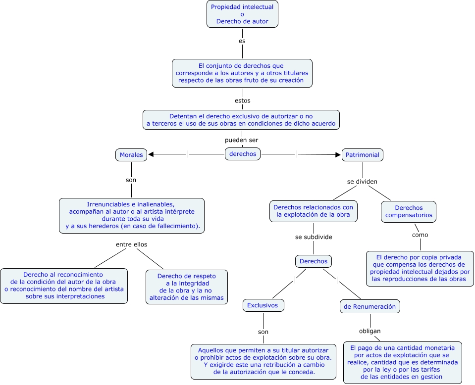 Este Cmap, tiene información relacionada con: Propiedad Intelectual! 1, Morales son Irrenunciables e inalienables, acompañan al autor o al artista intérprete durante toda su vida y a sus herederos (en caso de fallecimiento)., Derechos Exclusivos, Exclusivos son Aquellos que permiten a su titular autorizar o prohibir actos de explotación sobre su obra. Y exigirde este una retribución a cambio de la autorización que le conceda., derechos Morales, Derechos de Renumeración, Detentan el derecho exclusivo de autorizar o no a terceros el uso de sus obras en condiciones de dicho acuerdo pueden ser derechos, derechos Patrimonial, Derechos compensatorios como El derecho por copia privada que compensa los derechos de propiedad intelectual dejados por las reproducciones de las obras, Irrenunciables e inalienables, acompañan al autor o al artista intérprete durante toda su vida y a sus herederos (en caso de fallecimiento). entre ellos Derecho de respeto a la integridad de la obra y la no alteración de las mismas, de Renumeración obligan El pago de una cantidad monetaria por actos de explotación que se realice, cantidad que es determinada por la ley o por las tarifas de las entidades en gestion, El conjunto de derechos que corresponde a los autores y a otros titulares respecto de las obras fruto de su creación estos Detentan el derecho exclusivo de autorizar o no a terceros el uso de sus obras en condiciones de dicho acuerdo, Patrimonial se dividen Derechos compensatorios, Propiedad intelectual o Derecho de autor es El conjunto de derechos que corresponde a los autores y a otros titulares respecto de las obras fruto de su creación, Derechos relacionados con la explotación de la obra se subdivide Derechos, Patrimonial se dividen Derechos relacionados con la explotación de la obra, Irrenunciables e inalienables, acompañan al autor o al artista intérprete durante toda su vida y a sus herederos (en caso de fallecimiento). entre ellos Derecho al reconocimiento de la condición del autor de la obra o reconocimiento del nombre del artista sobre sus interpretaciones