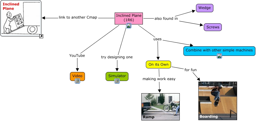 This Concept Map, created with IHMC CmapTools, has information related to: 1R6_InclinedPlane, Inclined Plane (1R6) also found in Screws, Inclined Plane (1R6) YouTube Video, On its Own making work easy Ramp, On its Own for fun Boarding, Inclined Plane (1R6) try designing one Simulator, Inclined Plane (1R6) uses On its Own, Inclined Plane (1R6) uses Combine with other simple machines, Inclined Plane (1R6) also found in Wedge