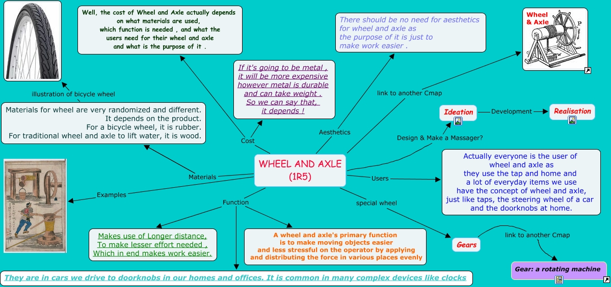 This Concept Map, created with IHMC CmapTools, has information related to: 1R5_WheelAxle_Weihong&Kerwin, WHEEL AND AXLE (1R5) Function Makes use of Longer distance, To make lesser effort needed , Which in end makes work easier., WHEEL AND AXLE (1R5) Users Actually everyone is the user of wheel and axle as they use the tap and home and a lot of everyday items we use have the concept of wheel and axle, just like taps, the steering wheel of a car and the doorknobs at home., WHEEL AND AXLE (1R5) Function A wheel and axle's primary function is to make moving objects easier and less stressful on the operator by applying and distributing the force in various places evenly, WHEEL AND AXLE (1R5) Aesthetics There should be no need for aesthetics for wheel and axle as the purpose of it is just to make work easier ., Ideation Development Realisation, WHEEL AND AXLE (1R5) Materials Materials for wheel are very randomized and different. It depends on the product. For a bicycle wheel, it is rubber. For traditional wheel and axle to lift water, it is wood., WHEEL AND AXLE (1R5) Cost If it's going to be metal , it will be more expensive however metal is durable and can take weight . So we can say that, it depends !, WHEEL AND AXLE (1R5) Cost Well, the cost of Wheel and Axle actually depends on what materials are used, which function is needed , and what the users need for their wheel and axle and what is the purpose of it ., Materials for wheel are very randomized and different. It depends on the product. For a bicycle wheel, it is rubber. For traditional wheel and axle to lift water, it is wood. illustration of bicycle wheel, WHEEL AND AXLE (1R5) Design & Make a Massager? Ideation, WHEEL AND AXLE (1R5) Materials Materials for wheel are very randomized and different. It depends on the product. For a bicycle wheel, it is rubber. For traditional wheel and axle to lift water, it is wood., WHEEL AND AXLE (1R5) special wheel Gears, WHEEL AND AXLE (1R5) Examples, Gears link to another Cmap Gear: a rotating machine, WHEEL AND AXLE (1R5) Function They are in cars we drive to doorknobs in our homes and offices. It is common in many complex devices like clocks, WHEEL AND AXLE (1R5) link to another Cmap Wheel & Axle