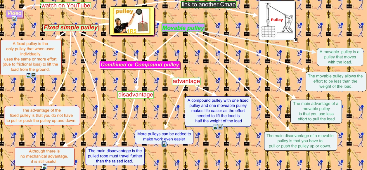 This Concept Map, created with IHMC CmapTools, has information related to: 1R5_Pulley.cmap, 1R5 Movable pulley The main disadvantage of a movable pulley is that you have to pull or push the pulley up or down., 1R5 Fixed simple pulley Although there is no mechanical advantage, it is still useful., 1R5 Movable pulley Combined or Compound pulley, 1R5 watch on YouTube Video, Combined or Compound pulley advantage A compound pulley with one fixed pulley and one moveable pulley makes life easier as the effort needed to lift the load is half the weight of the load, 1R5 Fixed simple pulley Combined or Compound pulley, 1R5 Movable pulley A movable pulley is a pulley that moves with the load., Combined or Compound pulley advantage More pulleys can be added to make work even easier, 1R5 Fixed simple pulley The advantage of the fixed pulley is that you do not have to pull or push the pulley up and down., 1R5 Fixed simple pulley A fixed pulley is the only pulley that when used individually, uses the same or more effort (due to frictional loss) to lift the load from the ground., Combined or Compound pulley disadvantage The main disadvantage is the pulled rope must travel further than the raised load., 1R5 Movable pulley The movable pulley allows the effort to be less than the weight of the load., 1R5 Movable pulley The main advantage of a movable pulley is that you use less effort to pull the load