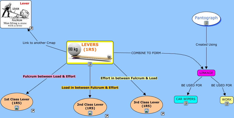 This Concept Map, created with IHMC CmapTools, has information related to: 1R5_Levers, LINKAGE BE USED FOR WORK, LINKAGE BE USED FOR CAR WIPERS, LEVERS (1R5) Effort in between Fulcrum & Load 3rd Class Lever (1R5), LEVERS (1R5) Load in between Fulcrum & Effort 2nd Class Lever (1R5), Pantograph Created Using LINKAGE, LEVERS (1R5) COMBINE TO FORM LINKAGE