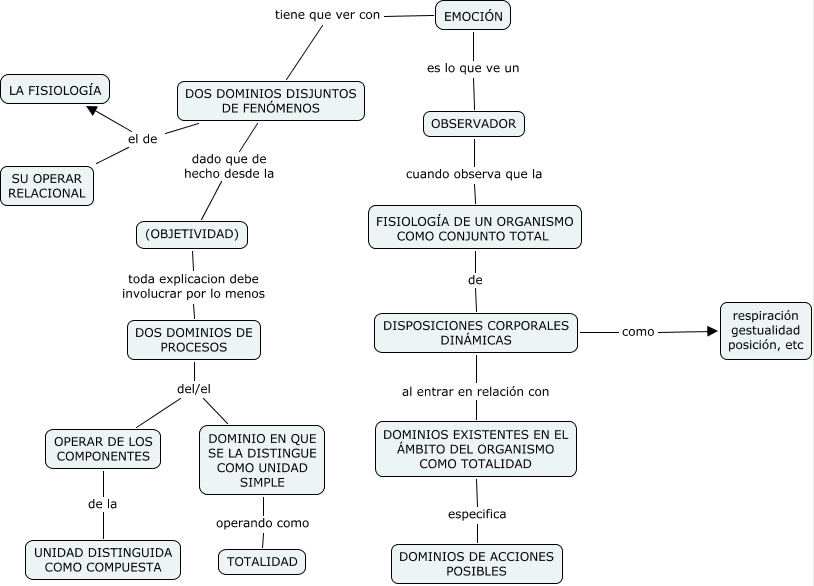 Este Cmap, tiene información relacionada con: EMOCIÓN, EMOCIÓN tiene que ver con DOS DOMINIOS DISJUNTOS DE FENÓMENOS, DISPOSICIONES CORPORALES DINÁMICAS al entrar en relación con DOMINIOS EXISTENTES EN EL ÁMBITO DEL ORGANISMO COMO TOTALIDAD, (OBJETIVIDAD) toda explicacion debe involucrar por lo menos DOS DOMINIOS DE PROCESOS, FISIOLOGÍA DE UN ORGANISMO COMO CONJUNTO TOTAL de DISPOSICIONES CORPORALES DINÁMICAS, EMOCIÓN es lo que ve un OBSERVADOR, OBSERVADOR cuando observa que la FISIOLOGÍA DE UN ORGANISMO COMO CONJUNTO TOTAL, DOMINIO EN QUE SE LA DISTINGUE COMO UNIDAD SIMPLE operando como TOTALIDAD, DOS DOMINIOS DISJUNTOS DE FENÓMENOS dado que de hecho desde la (OBJETIVIDAD), DOS DOMINIOS DISJUNTOS DE FENÓMENOS el de SU OPERAR RELACIONAL, DOS DOMINIOS DE PROCESOS del/el OPERAR DE LOS COMPONENTES, DOS DOMINIOS DE PROCESOS del/el DOMINIO EN QUE SE LA DISTINGUE COMO UNIDAD SIMPLE, DISPOSICIONES CORPORALES DINÁMICAS como respiración gestualidad posición, etc, DOMINIOS EXISTENTES EN EL ÁMBITO DEL ORGANISMO COMO TOTALIDAD especifica DOMINIOS DE ACCIONES POSIBLES, DOS DOMINIOS DISJUNTOS DE FENÓMENOS el de LA FISIOLOGÍA, OPERAR DE LOS COMPONENTES de la UNIDAD DISTINGUIDA COMO COMPUESTA