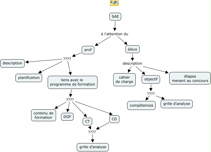 Cette carte de concepts créée avec IHMC CmapTools traite de: schéma SAE_Bolide, élève description objectif, élève description cahier de charge, liens avec le programme de formation ???? CD, prof ???? liens avec le programme de formation, liens avec le programme de formation ???? CT, SAE à l'attention du prof, liens avec le programme de formation ???? contenu de formation, objectif ???? grille d'analyse, SAE à l'attention du élève, prof ???? planification, prof ???? description, CD ???? grille d'analyse, objectif ???? compétences, CT ???? grille d'analyse, liens avec le programme de formation ???? DGF, élève description étapes menant au concours