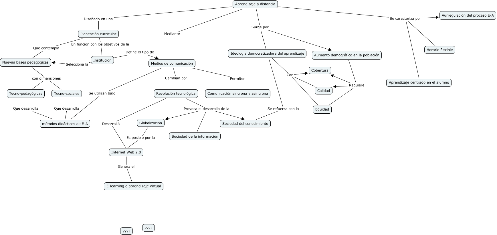 Este Cmap, tiene información relacionada con: Aprendizaje a distancia, Institución Selecciona la Nuevas bases pedagógicas, Medios de comunicación Se utilizan bajo métodos didácticos de E-A, Internet Web 2.0 Genera el E-learning o aprendizaje virtual, Aprendizaje a distancia Surge por Aumento demográfico en la población, Aumento demográfico en la población Requiere Equidad, Revolución tecnológica Provoca el desarrollo de la Globalización, Tecno-sociales Que desarrolla métodos didácticos de E-A, Aprendizaje a distancia Se caracteriza por Aurregulación del proceso E-A, Tecno-pedagógicas Que desarrolla métodos didácticos de E-A, Revolución tecnológica Provoca el desarrollo de la Sociedad del conocimiento, Medios de comunicación Cambian por Revolución tecnológica, Aprendizaje a distancia Diseñado en una Planeación curricular, Aprendizaje a distancia Mediante Medios de comunicación, Aumento demográfico en la población Requiere Cobertura, Revolución tecnológica Provoca el desarrollo de la Sociedad de la información, Planeación curricular En función con los objetivos de la Institución, Aprendizaje a distancia Se caracteriza por Horario flexible, Medios de comunicación Permiten Comunicación síncrona y asíncrona, Ideología democratizadora del aprendizaje Con Equidad, Aumento demográfico en la población Requiere Calidad
