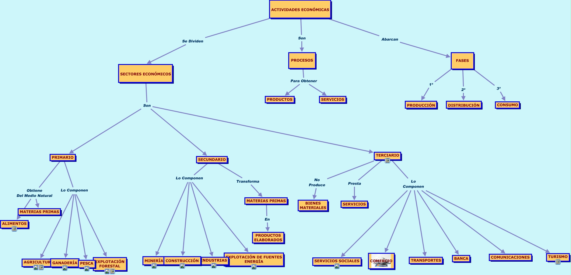 Este Cmap, tiene información relacionada con: actividades_economicas, SECUNDARIO Lo Componen MINERÍA, FASES 1ª PRODUCCIÓN, TERCIARIO Lo Componen BANCA, PRIMARIO Lo Componen PESCA, SECTORES ECONÓMICOS Son PRIMARIO, SECTORES ECONÓMICOS Son TERCIARIO, ACTIVIDADES ECONÓMICAS Se Dividen SECTORES ECONÓMICOS, PROCESOS Para Obtener SERVICIOS, PRIMARIO Lo Componen GANADERÍA, TERCIARIO Lo Componen TURISMO, SECUNDARIO Transforma MATERIAS PRIMAS, SECUNDARIO Lo Componen INDUSTRIAS, TERCIARIO Lo Componen COMERCIO, ACTIVIDADES ECONÓMICAS Son PROCESOS, MATERIAS PRIMAS En PRODUCTOS ELABORADOS, PRIMARIO Obtiene Del Medio Natural ALIMENTOS, PRIMARIO Lo Componen EXPLOTACIÓN FORESTAL, FASES 3ª CONSUMO, SECUNDARIO Lo Componen CONSTRUCCIÓN, TERCIARIO Lo Componen SERVICIOS SOCIALES