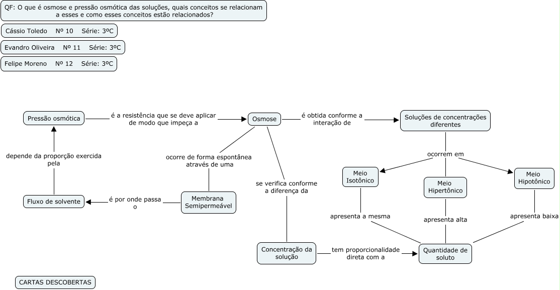 Esse mapa conceitual, produzido no IHMC CmapTools, tem a informação relacionada a: Osmose, Cássio, Evandro, Felipe 3ºC, Osmose se verifica conforme a diferença da Concentração da solução, Fluxo de solvente depende da proporção exercida pela Pressão osmótica, Meio Hipotônico apresenta baixa Quantidade de soluto, Pressão osmótica é a resistência que se deve aplicar de modo que impeça a Osmose, Meio Hipertônico apresenta alta Quantidade de soluto, Concentração da solução tem proporcionalidade direta com a Quantidade de soluto, Soluções de concentrações diferentes ocorrem em Meio Hipertônico, Osmose é obtida conforme a interação de Soluções de concentrações diferentes, Meio Isotônico apresenta a mesma Quantidade de soluto, Osmose ocorre de forma espontânea através de uma Membrana Semipermeável, Soluções de concentrações diferentes ocorrem em Meio Hipotônico, Membrana Semipermeável é por onde passa o Fluxo de solvente, Soluções de concentrações diferentes ocorrem em Meio Isotônico