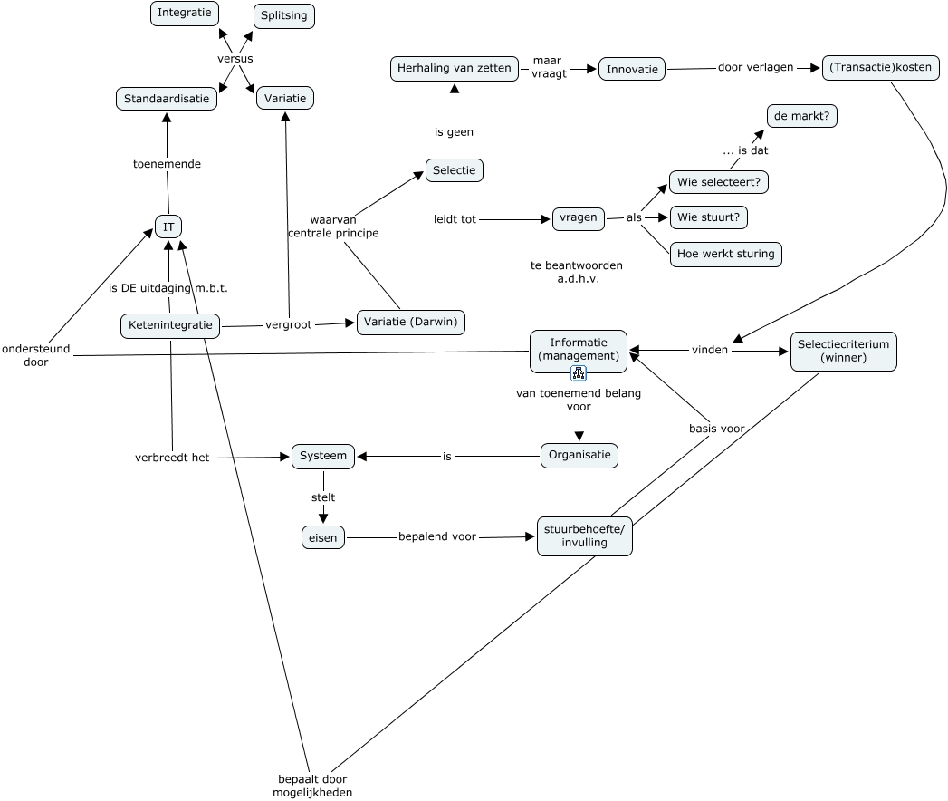 Deze Concept Map heeft informatie gerelateerd aan: Workshop InformatieManagement, Selectie is geen Herhaling van zetten, Organisatie is Systeem, vragen als Wie stuurt?, Herhaling van zetten maar vraagt Innovatie, vragen als Wie selecteert?, Ketenintegratie verbreedt het Systeem, Ketenintegratie vergroot Variatie (Darwin), Ketenintegratie is DE uitdaging m.b.t. IT, eisen bepalend voor stuurbehoefte/ invulling, (Transactie)kosten vinden Selectiecriterium (winner), vragen als Hoe werkt sturing, Selectiecriterium (winner) bepaalt door mogelijkheden IT, Ketenintegratie vergroot Variatie, Selectie leidt tot vragen, vragen te beantwoorden a.d.h.v. Informatie (management), Informatie (management) ondersteund door IT, Wie selecteert? ... is dat de markt?, (Transactie)kosten vinden Informatie (management), stuurbehoefte/ invulling basis voor Informatie (management), Variatie (Darwin) waarvan centrale principe Selectie