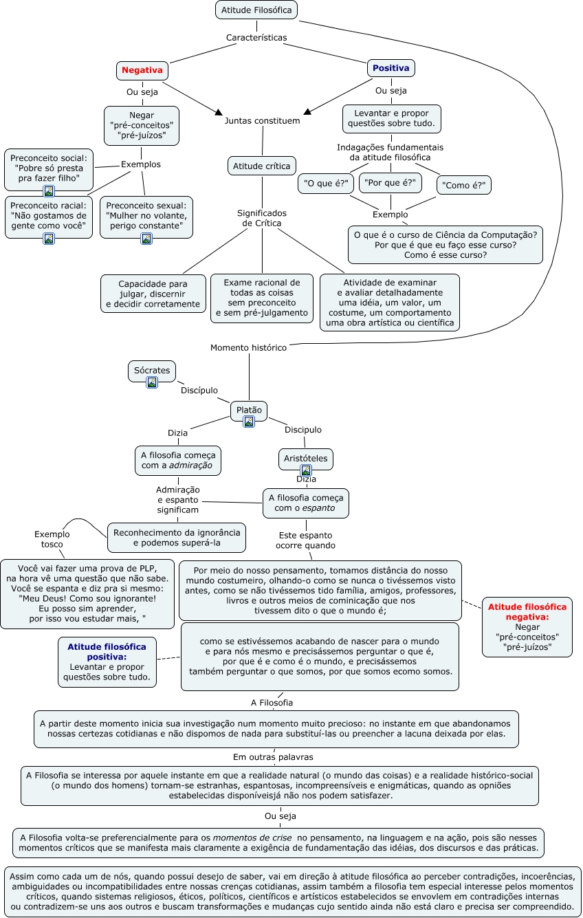 Esse mapa conceitual, produzido no IHMC CmapTools, tem a informação relacionada a: Atitude filosófica, Negar "pré-conceitos" "pré-juízos" Exemplos Preconceito social: "Pobre só presta pra fazer filho", A Filosofia se interessa por aquele instante em que a realidade natural (o mundo das coisas) e a realidade histórico-social (o mundo dos homens) tornam-se estranhas, espantosas, incompreensíveis e enigmáticas, quando as opniões estabelecidas disponíveisjá não nos podem satisfazer. Ou seja A Filosofia volta-se preferencialmente para os momentos de crise no pensamento, na linguagem e na ação, pois são nesses momentos críticos que se manifesta mais claramente a exigência de fundamentação das idéias, dos discursos e das práticas., A filosofia começa com o espanto Este espanto ocorre quando Por meio do nosso pensamento, tomamos distância do nosso mundo costumeiro, olhando-o como se nunca o tivéssemos visto antes, como se não tivéssemos tido família, amigos, professores, livros e outros meios de cominicação que nos tivessem dito o que o mundo é;, Atitude crítica Significados de Crítica Capacidade para julgar, discernir e decidir corretamente, Atitude Filosófica Momento histórico Platão, "Por que é?" Exemplo O que é o curso de Ciência da Computação? Por que é que eu faço esse curso? Como é esse curso?, "O que é?" Exemplo O que é o curso de Ciência da Computação? Por que é que eu faço esse curso? Como é esse curso?, Levantar e propor questões sobre tudo. Indagações fundamentais da atitude filosófica "Por que é?", Levantar e propor questões sobre tudo. Indagações fundamentais da atitude filosófica "O que é?", Reconhecimento da ignorância e podemos superá-la Exemplo tosco Você vai fazer uma prova de PLP, na hora vê uma questão que não sabe. Você se espanta e diz pra si mesmo: "Meu Deus! Como sou ignorante! Eu posso sim aprender, por isso vou estudar mais, ", A filosofia começa com o espanto Admiração e espanto significam Reconhecimento da ignorância e podemos superá-la, Negar "pré-conceitos" "pré-juízos" Exemplos Preconceito racial: "Não gostamos de gente como você", A partir deste momento inicia sua investigação num momento muito precioso: no instante em que abandonamos nossas certezas cotidianas e não dispomos de nada para substituí-las ou preencher a lacuna deixada por elas. Em outras palavras A Filosofia se interessa por aquele instante em que a realidade natural (o mundo das coisas) e a realidade histórico-social (o mundo dos homens) tornam-se estranhas, espantosas, incompreensíveis e enigmáticas, quando as opniões estabelecidas disponíveisjá não nos podem satisfazer., Levantar e propor questões sobre tudo. Indagações fundamentais da atitude filosófica "Como é?", Positiva Juntas constituem Atitude crítica, Negativa Juntas constituem Atitude crítica, Por meio do nosso pensamento, tomamos distância do nosso mundo costumeiro, olhando-o como se nunca o tivéssemos visto antes, como se não tivéssemos tido família, amigos, professores, livros e outros meios de cominicação que nos tivessem dito o que o mundo é; ???? Atitude filosófica negativa: Negar "pré-conceitos" "pré-juízos", como se estivéssemos acabando de nascer para o mundo e para nós mesmo e precisássemos perguntar o que é, por que é e como é o mundo, e precisássemos também perguntar o que somos, por que somos ecomo somos. ???? Atitude filosófica positiva: Levantar e propor questões sobre tudo., "Como é?" Exemplo O que é o curso de Ciência da Computação? Por que é que eu faço esse curso? Como é esse curso?, Atitude crítica Significados de Crítica Exame racional de todas as coisas sem preconceito e sem pré-julgamento