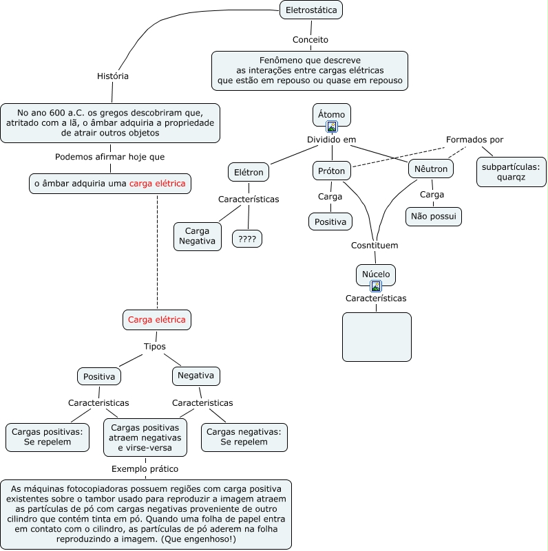 Esse mapa conceitual, produzido no IHMC CmapTools, tem a informação relacionada a: Carga elétrica, Nêutron Cosntituem Núcelo, Carga elétrica Tipos Positiva, Cargas negativas: Se repelem Caracteristicas Cargas positivas atraem negativas e virse-versa, Positiva Caracteristicas Cargas positivas atraem negativas e virse-versa, No ano 600 a.C. os gregos descobriram que, atritado com a lã, o âmbar adquiria a propriedade de atrair outros objetos Podemos afirmar hoje que o âmbar adquiria uma carga elétrica, Núcelo Características, Próton Carga Positiva, Nêutron Carga Não possui, Elétron Características ????, Próton Cosntituem Núcelo, Átomo Dividido em Nêutron, Eletrostática Conceito Fenômeno que descreve as interações entre cargas elétricas que estão em repouso ou quase em repouso, o âmbar adquiria uma carga elétrica ???? Carga elétrica, Próton Formados por subpartículas: quarqz, Eletrostática História No ano 600 a.C. os gregos descobriram que, atritado com a lã, o âmbar adquiria a propriedade de atrair outros objetos, Cargas positivas atraem negativas e virse-versa Exemplo prático As máquinas fotocopiadoras possuem regiões com carga positiva existentes sobre o tambor usado para reproduzir a imagem atraem as partículas de pó com cargas negativas proveniente de outro cilindro que contém tinta em pó. Quando uma folha de papel entra em contato com o cilindro, as partículas de pó aderem na folha reproduzindo a imagem. (Que engenhoso!), Átomo Dividido em Próton, Nêutron Formados por subpartículas: quarqz, Positiva Caracteristicas Cargas positivas: Se repelem, Carga elétrica Tipos Negativa