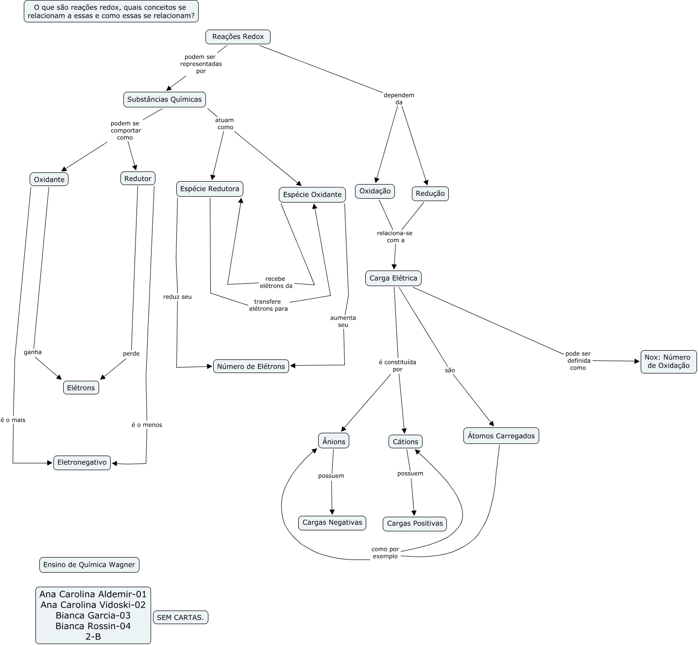 This Concept Map, created with IHMC CmapTools, has information related to: Reações Redox Alunos 1-4 2.B, Espécie Redutora reduz seu Número de Elétrons, Substâncias Químicas podem se comportar como Oxidante, Espécie Oxidante aumenta seu Número de Elétrons, Reações Redox dependem da Redução, Redutor perde Elétrons, Oxidante ganha Elétrons, Substâncias Químicas atuam como Espécie Redutora, Reações Redox dependem da Oxidação, Ânions possuem Cargas Negativas, Oxidante é o mais Eletronegativo, Carga Elétrica pode ser definida como Nox: Número de Oxidação, Cátions possuem Cargas Positivas, Espécie Redutora transfere elétrons para Espécie Oxidante, Carga Elétrica é constituída por Cátions, Átomos Carregados como por exemplo Ânions, Substâncias Químicas podem se comportar como Redutor, Reações Redox podem ser representadas por Substâncias Químicas, Oxidação relaciona-se com a Carga Elétrica, Redução relaciona-se com a Carga Elétrica, Espécie Oxidante recebe elétrons da Espécie Redutora