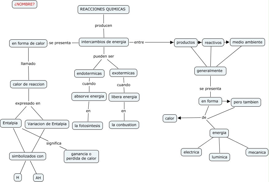 Este Cmap, tiene información relacionada con: REACCIONES QUIMICAS 00, calor de reaccion expresado en Variacion de Entalpia, energia ???? mecanica, intercambios de energia entre productos, pero tambien de energia, calor de reaccion expresado en Entalpia, Variacion de Entalpia ???? simbolizados con, en forma de calor, REACCIONES QUIMICAS producen intercambios de energia, en forma ???? pero tambien, simbolizados con ???? AH, intercambios de energia entre medio ambiente, simbolizados con ???? H, absorve energia en la fotosintesis, pero tambien de calor, intercambios de energia pueden ser exotermicas, intercambios de energia pueden ser endotermicas, endotermicas cuando absorve energia, medio ambiente ???? generalmente, energia ???? luminica, generalmente se presenta en forma