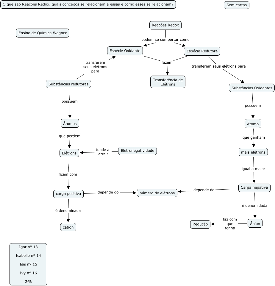 Esse mapa conceitual, produzido no IHMC CmapTools, tem a informação relacionada a: Reações Redox. 2B. 13 ao 16, Eletronegatividade tende a atrair Elétrons, Espécie Oxidante fazem Transferência de Elétrons, mais elétrons igual a maior Carga negativa, Espécie Redutora fazem Transferência de Elétrons, Reações Redox podem se comportar como Espécie Redutora, Substâncias Oxidantes possuem Átomo, Espécie Redutora transferem seus elétrons para Substâncias Oxidantes, carga positiva é denominada cátion, Substâncias redutoras transferem seus elétrons para Espécie Oxidante, Reações Redox podem se comportar como Espécie Oxidante, carga positiva depende do número de elétrons, Átomos que perdem Elétrons, Carga negativa depende do número de elétrons, Carga negativa é denomidada Ânion, Elétrons ficam com carga positiva, Átomo que ganham mais elétrons, Ânion faz com que tenha Redução, Substâncias redutoras possuem Átomos