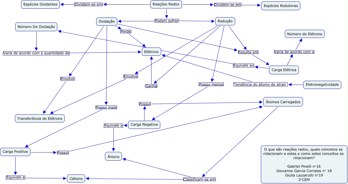 Esse mapa conceitual, produzido no IHMC CmapTools, tem a informação relacionada a: Trabalho de Química Giulia com carta 2°CEM, Redução Envolve Transferência de Elétrons, Àtomos Carregados Classificam-se em Cátions, Àtomos Carregados Classificam-se em Ânions, Oxidação Possui mais Carga Positiva, Eletronegatividade Tendência do átomo de atrair Elétrons, Oxidação Envolve Transferência de Elétrons, Reações Redox Diviidem-se em Espécies Oxidantes, Carga Positiva Possui Àtomos Carregados, Reações Redox Dividem-se em Espécies Redutoras, Reações Redox Podem sofrer Oxidação, Oxidação Resulta em Carga Elétrica, Carga Negativa Equivale a Ânions, Carga Elétrica Varia de acordo com o Número de Elétrons, Redução Resulta em Carga Elétrica, Número De Oxidação Varia de acordo com a quantidade de Elétrons, Carga Elétrica Equivale ao Número De Oxidação, Carga Positiva Equivale a Cátions, Reações Redox Podem sofrer Redução, Carga Negativa Possui Àtomos Carregados, Redução Possui menos Carga Negativa