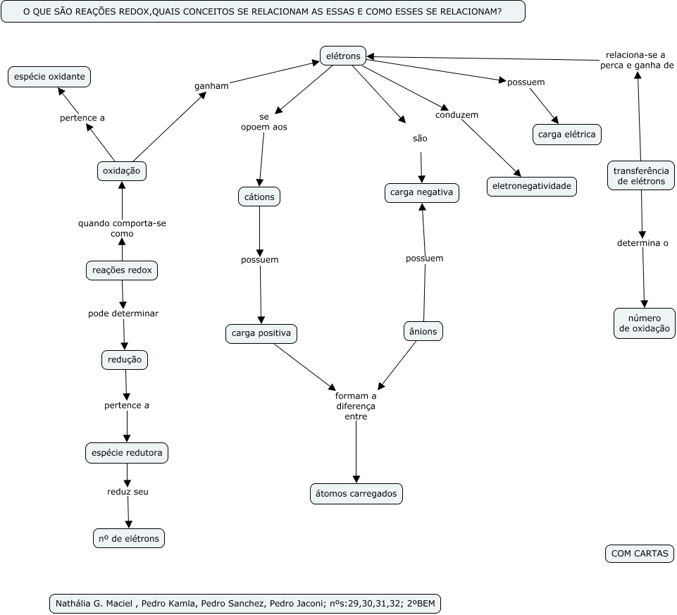 Esse mapa conceitual, produzido no IHMC CmapTools, tem a informação relacionada a: reaçoes redox - nathalia 2b, cátions possuem carga positiva, carga positiva formam a diferença entre átomos carregados, oxidação ganham elétrons, transferência de elétrons determina o número de oxidação, elétrons conduzem eletronegatividade, oxidação pertence a espécie oxidante, espécie redutora reduz seu nº de elétrons, ânions formam a diferença entre átomos carregados, redução pertence a espécie redutora, ânions possuem carga negativa, reações redox quando comporta-se como oxidação, elétrons possuem carga elétrica, transferência de elétrons relaciona-se a perca e ganha de elétrons, elétrons se opoem aos cátions, elétrons são carga negativa, reações redox pode determinar redução