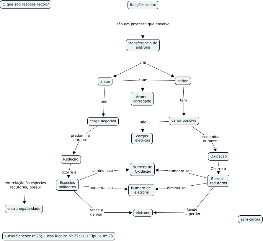 Esse mapa conceitual, produzido no IHMC CmapTools, tem a informação relacionada a: Redox 2ºC numeros 26, 27 e 28, Especies oxidantes aumenta seu Numero de eletrons, transferencia de eletrons cria ânion, carga positiva são cargas eletricas, Epecies redutoras aumenta seu Numero de Oxidação, carga negativa são cargas eletricas, Especies oxidantes em relação às especies redutoras, possui eletronegatividade, Redução ocorre à Especies oxidantes, Reações redox são um processo que envolve transferencia de eletrons, Especies oxidantes diminui seu Numero de Oxidação, Especies oxidantes tende a ganhar eletrons, carga negativa predomina durante Redução, ânion é um Átomo carregado, cátion é um Átomo carregado, transferencia de eletrons cria cátion, ânion tem carga negativa, Oxidação Ocorre à Epecies redutoras, Epecies redutoras diminui seu Numero de eletrons, Epecies redutoras tende a perder eletrons, cátion tem carga positiva, carga positiva predomina durante Oxidação