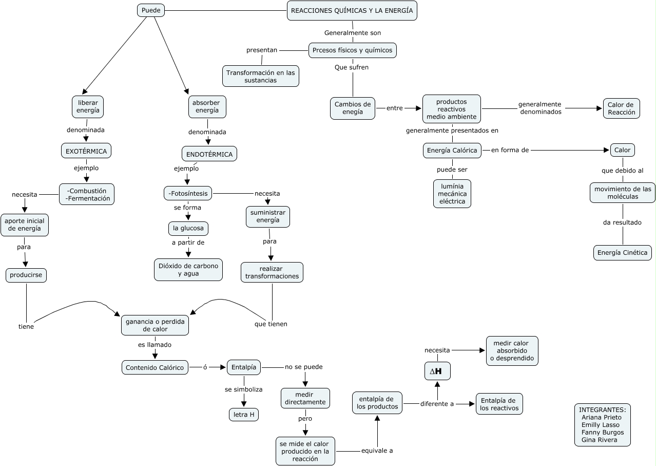 Este Cmap, tiene información relacionada con: REACCIONES QUIMICAS Y LA ENERGÍA, REACCIONES QUÍMICAS Y LA ENERGÍA ???? Puede, -Combustión -Fermentación necesita aporte inicial de energía, productos reactivos medio ambiente generalmente denominados Calor de Reacción, Prcesos físicos y químicos Que sufren Cambios de enegía, se mide el calor producido en la reacción equivale a entalpía de los productos, medir directamente pero se mide el calor producido en la reacción, productos reactivos medio ambiente generalmente presentados en Energía Calórica, -Fotosíntesis se forma la glucosa, Entalpía no se puede medir directamente, ENDOTÉRMICA ejemplo -Fotosíntesis, REACCIONES QUÍMICAS Y LA ENERGÍA Generalmente son Prcesos físicos y químicos, Calor que debido al movimiento de las moléculas, Cambios de enegía entre productos reactivos medio ambiente, entalpía de los productos diferente a ΔH, la glucosa a partir de Dióxido de carbono y agua, -Fotosíntesis necesita suministrar energía, Puede ???? absorber energía, Puede ???? liberar energía, ganancia o perdida de calor es llamado Contenido Calórico, suministrar energía para realizar transformaciones