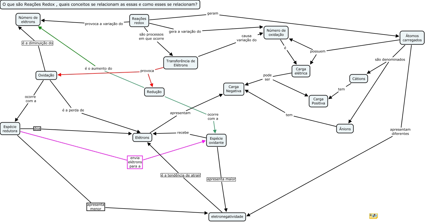 Esse mapa conceitual, produzido no IHMC CmapTools, tem a informação relacionada a: Reações redox 2ºB, Átomos carregados são denominados Cátions, Espécie redutora apresenta menor eletronegatividade, Reações redox geram Átomos carregados, Elétrons apresentam Carga Negativa, Espécie oxidante recebe Elétrons, Redução é o aumento do Número de elétrons, Carga elétrica pode ser Carga Negativa, Redução ocorre com a Espécie oxidante, Espécie redutora doa Elétrons, Transferência de Elétrons provoca Redução, Reações redox são processos em que ocorre Transferência de Elétrons, Número de oxidação é Carga elétrica, Oxidação é a diminuição do Número de elétrons, Reações redox gera a variação do Número de oxidação, Ânions tem Carga Negativa, Átomos carregados possuem Número de oxidação, Espécie oxidante apresenta maior eletronegatividade, Carga elétrica pode ser Carga Positiva, Átomos carregados possuem Carga elétrica, Transferência de Elétrons provoca Oxidação
