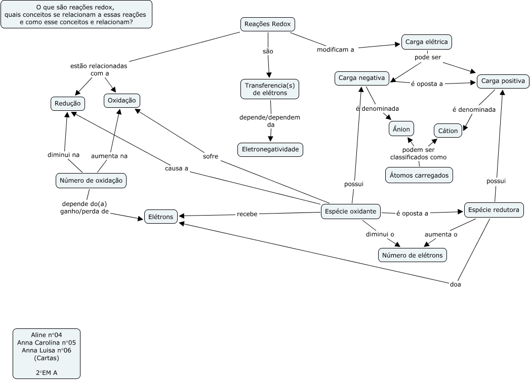 Esse mapa conceitual, produzido no IHMC CmapTools, tem a informação relacionada a: Reações Redox n° 04,05 e 06, Carga negativa é oposta a Carga positiva, Espécie redutora doa Elétrons, Espécie oxidante diminui o Número de elétrons, Reações Redox estão relacionadas com a Redução, Reações Redox são Transferencia(s) de elétrons, Espécie oxidante é oposta a Espécie redutora, Espécie redutora aumenta o Número de elétrons, Carga positiva é denominada Cátion, Transferencia(s) de elétrons depende/dependem da Eletronegatividade, Espécie oxidante possui Carga negativa, Número de oxidação depende do(a) ganho/perda de Elétrons, Espécie oxidante causa a Redução, Reações Redox estão relacionadas com a Oxidação, Espécie oxidante sofre Oxidação, Carga elétrica pode ser Carga negativa, Átomos carregados podem ser classificados como Ânion, Reações Redox modificam a Carga elétrica, Átomos carregados podem ser classificados como Cátion, Espécie redutora possui Carga positiva, Espécie oxidante recebe Elétrons