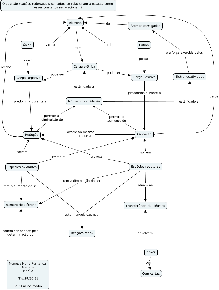 Esse mapa conceitual, produzido no IHMC CmapTools, tem a informação relacionada a: Reações Redox-Maria Fernanda-2°C, Espécies oxidantes sofrem Redução, poker com Com cartas, Cátion possui Carga Positiva, Número de oxidação está ligado a Carga elétrica, Oxidação ocorre ao mesmo tempo que a Redução, Carga elétrica pode ser Carga Positiva, Espécies redutoras provocam Redução, Redução permite a diminuição do Número de oxidação, Ânion ganha elétrons, Reações redox podem ser obtidas pela determinação do número de elétrons, Número de oxidação está ligado a Eletronegatividade, Cátion perde elétrons, Carga Positiva predomina durante a Oxidação, Espécies oxidantes provocam Oxidação, Espécies oxidantes tem o aumento do seu número de elétrons, Oxidação perde elétrons, Espécies redutoras estam envolvidas nas Reações redox, Redução recebe elétrons, Espécies redutoras tem a diminuição do seu número de elétrons, Carga Negativa predomina durante a Redução