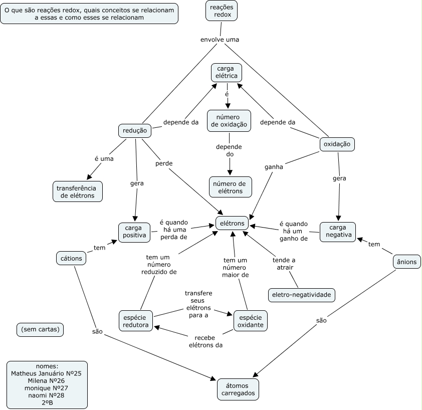Esse mapa conceitual, produzido no IHMC CmapTools, tem a informação relacionada a: reaçoes redox numeros 25 a 28, cátions tem carga positiva, cátions são átomos carregados, espécie oxidante tem um número maior de elétrons, reações redox envolve uma oxidação, reações redox envolve uma redução, espécie redutora tem um número reduzido de elétrons, ânions tem carga negativa, carga negativa é quando há um ganho de elétrons, espécie oxidante recebe elétrons da espécie redutora, oxidação gera carga negativa, número de oxidação depende do número de elétrons, oxidação ganha elétrons, redução depende da carga elétrica, redução gera carga positiva, redução é uma transferência de elétrons, carga elétrica é número de oxidação, carga positiva é quando há uma perda de elétrons, eletro-negatividade tende a atrair elétrons, oxidação depende da carga elétrica, redução perde elétrons