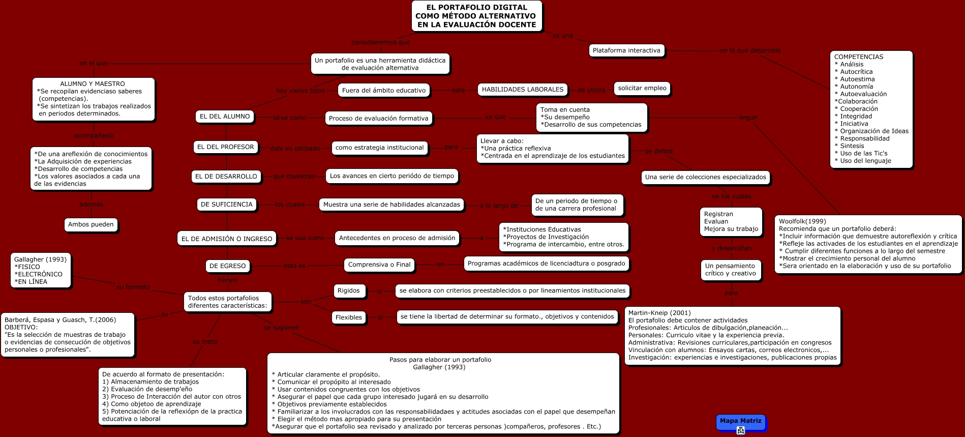Este Cmap, tiene información relacionada con: M-7 EL PORTAFOLIO DIGITAL COMO MÉTODO ALTERNATIVO EN LA EVALUACIÓN, EL DEL PROFESOR ???? EL DE DESARROLLO, EL DEL ALUMNO sirve como Proceso de evaluación formativa, Todos estos portafolios diferentes características: son Flexibles, EL PORTAFOLIO DIGITAL COMO MÉTODO ALTERNATIVO EN LA EVALUACIÓN DOCENTE es una Plataforma interactiva, Antecedentes en proceso de admisión a *Instituciones Educativas *Proyectos de Investigación *Programa de intercambio, entre otros., EL DEL ALUMNO ???? EL DEL PROFESOR, ALUMNO Y MAESTRO *Se recopilan evidenciaso saberes (competencias). *Se sintetizan los trabajos realizados en periodos determinados. acompañado *De una areflexión de conocimientos *La Adquisición de experiencias *Desarrollo de competencias *Los valores asociados a cada una de las evidencias, HABILIDADES LABORALES se utiliza solicitar empleo, EL DEL PROFESOR éste es utilizado como estrategia institucional, Muestra una serie de habilidades alcanzadas a lo largo de De un periodo de tiempo o de una carrera profesional, DE EGRESO esta es Comprensiva o Final, Llevar a cabo: *Una práctica reflexiva *Centrada en el aprendizaje de los estudiantes se define Una serie de colecciones especializados, EL DE DESARROLLO ???? DE SUFICIENCIA, Todos estos portafolios diferentes características: su Barberá, Espasa y Guasch, T.(2006) OBJETIVO: "Es la selección de muestras de trabajo o evidencias de consecución de objetivos personales o profesionales"., Un pensamiento crítico y creativo para Martin-Kneip (2001) El portafolio debe contener actividades Profesionales: Articulos de dibulgación,planeación... Personales: Curriculo vitae y la experiencia previa. Administrativa: Revisiones curriculares,participación en congresos Vinculación con alumnos: Ensayos cartas, correos electronicos,... Investigación: experiencias e investigaciones, publicaciones propias, Una serie de colecciones especializados en los cuales Registran Evaluan Mejora su trabajo, EL DE ADMISIÓN O INGRESO ???? DE EGRESO, Fuera del ámbito educativo esta HABILIDADES LABORALES, como estrategia institucional para Llevar a cabo: *Una práctica reflexiva *Centrada en el aprendizaje de los estudiantes, Un portafolio es una herramienta didáctica de evaluación alternativa en el que ALUMNO Y MAESTRO *Se recopilan evidenciaso saberes (competencias). *Se sintetizan los trabajos realizados en periodos determinados.