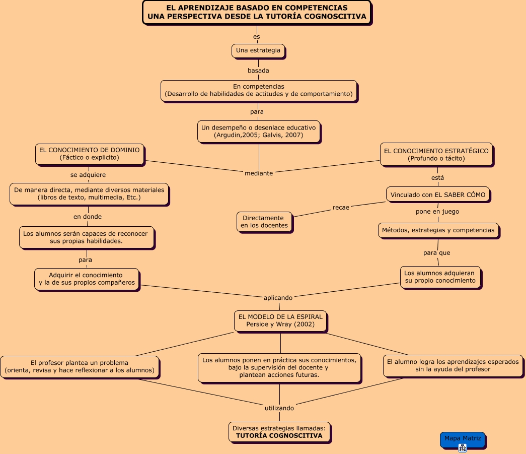 Este Cmap, tiene información relacionada con: M-4 EL APRENDIZAJE BASADO EN COMPETENCIAS, El profesor plantea un problema (orienta, revisa y hace reflexionar a los alumnos) utilizando Diversas estrategias llamadas: TUTORÍA COGNOSCITIVA, En competencias (Desarrollo de habilidades de actitudes y de comportamiento) para Un desempeño o desenlace educativo (Argudin,2005; Galvis, 2007), EL MODELO DE LA ESPIRAL Persioe y Wray (2002) ???? El alumno logra los aprendizajes esperados sin la ayuda del profesor, Un desempeño o desenlace educativo (Argudin,2005; Galvis, 2007) mediante EL CONOCIMIENTO DE DOMINIO (Fáctico o explicito), Métodos, estrategias y competencias para que Los alumnos adquieran su propio conocimiento, El profesor plantea un problema (orienta, revisa y hace reflexionar a los alumnos) utilizando Los alumnos ponen en práctica sus conocimientos, bajo la supervisión del docente y plantean acciones futuras., Adquirir el conocimiento y la de sus propios compañeros aplicando EL MODELO DE LA ESPIRAL Persioe y Wray (2002), Un desempeño o desenlace educativo (Argudin,2005; Galvis, 2007) mediante EL CONOCIMIENTO ESTRATÉGICO (Profundo o tácito), EL CONOCIMIENTO DE DOMINIO (Fáctico o explicito) se adquiere De manera directa, mediante diversos materiales (libros de texto, multimedia, Etc.), EL MODELO DE LA ESPIRAL Persioe y Wray (2002) ???? Los alumnos ponen en práctica sus conocimientos, bajo la supervisión del docente y plantean acciones futuras., EL APRENDIZAJE BASADO EN COMPETENCIAS UNA PERSPECTIVA DESDE LA TUTORÍA COGNOSCITIVA es Una estrategia, Los alumnos serán capaces de reconocer sus propias habilidades. para Adquirir el conocimiento y la de sus propios compañeros, EL CONOCIMIENTO ESTRATÉGICO (Profundo o tácito) está Vinculado con EL SABER CÓMO, El profesor plantea un problema (orienta, revisa y hace reflexionar a los alumnos) utilizando El alumno logra los aprendizajes esperados sin la ayuda del profesor, Adquirir el conocimiento y la de sus propios compañeros aplicando Los alumnos adquieran su propio conocimiento, EL MODELO DE LA ESPIRAL Persioe y Wray (2002) ???? El profesor plantea un problema (orienta, revisa y hace reflexionar a los alumnos), Una estrategia basada En competencias (Desarrollo de habilidades de actitudes y de comportamiento), Vinculado con EL SABER CÓMO recae Directamente en los docentes, Vinculado con EL SABER CÓMO pone en juego Métodos, estrategias y competencias, De manera directa, mediante diversos materiales (libros de texto, multimedia, Etc.) en donde Los alumnos serán capaces de reconocer sus propias habilidades.