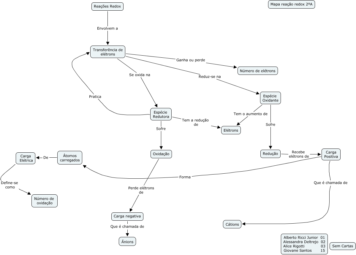 Esse mapa conceitual, produzido no IHMC CmapTools, tem a informação relacionada a: Reações Redox, nº 1, 2, 3 e 15, Transferência de elétrons Se oxida na Espécie Redutora, Espécie Oxidante Sofre Redução, Átomos carregados De Carga Elétrica, Redução Recebe elétrons de Carga Positiva, Espécie Oxidante Tem o aumento de Elétrons, Carga Elétrica Define-se como Número de oxidação, Reações Redox Envolvem a Transferência de elétrons, Oxidação Perde elétrons de Carga negativa, Transferência de elétrons Reduz-se na Espécie Oxidante, Carga Positiva Forma Átomos carregados, Carga negativa Que é chamada de Ânions, Transferência de elétrons Ganha ou perde Número de elétrons, Espécie Redutora Tem a redução de Elétrons, Espécie Redutora Sofre Oxidação, Espécie Redutora Pratica Transferência de elétrons, Carga Positiva Que é chamada de Cátions