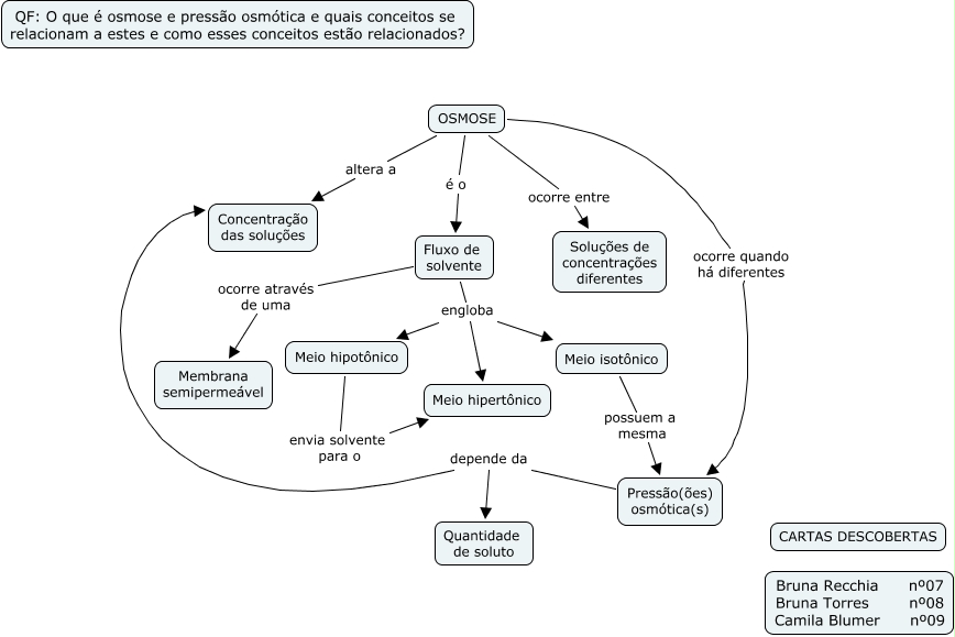 Esse mapa conceitual, produzido no IHMC CmapTools, tem a informação relacionada a: OSMOSE Brunas e Camila =), Fluxo de solvente ocorre através de uma Membrana semipermeável, OSMOSE é o Fluxo de solvente, Meio hipotônico envia solvente para o Meio hipertônico, Fluxo de solvente engloba Meio isotônico, Pressão(ões) osmótica(s) depende da Concentração das soluções, Fluxo de solvente engloba Meio hipotônico, OSMOSE ocorre entre Soluções de concentrações diferentes, Pressão(ões) osmótica(s) depende da Quantidade de soluto, Fluxo de solvente engloba Meio hipertônico, OSMOSE altera a Concentração das soluções, OSMOSE ocorre quando há diferentes Pressão(ões) osmótica(s), Meio isotônico possuem a mesma Pressão(ões) osmótica(s)