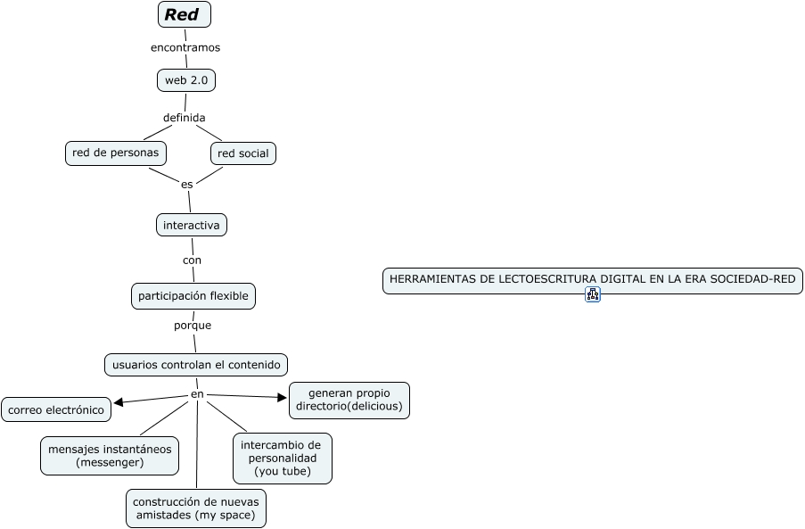 Este Cmap, tiene información relacionada con: red, red de personas es interactiva, participación flexible porque usuarios controlan el contenido, web 2.0 definida red de personas, usuarios controlan el contenido en generan propio directorio(delicious), web 2.0 definida red social, interactiva con participación flexible, red social es interactiva, usuarios controlan el contenido en correo electrónico, usuarios controlan el contenido en intercambio de personalidad (you tube), Red encontramos web 2.0, usuarios controlan el contenido en mensajes instantáneos (messenger), usuarios controlan el contenido en construcción de nuevas amistades (my space)