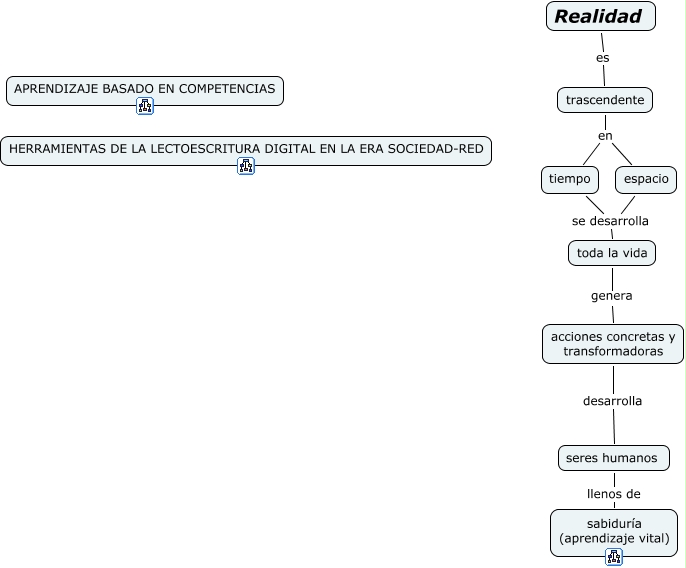 Este Cmap, tiene información relacionada con: realidad, seres humanos llenos de sabiduría (aprendizaje vital), trascendente en espacio, Realidad es trascendente, trascendente en tiempo, toda la vida genera acciones concretas y transformadoras, espacio se desarrolla toda la vida, tiempo se desarrolla toda la vida, acciones concretas y transformadoras desarrolla seres humanos