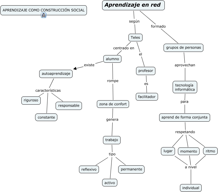 Este Cmap, tiene información relacionada con: aprendizaje en red, grupos de personas aprovechan tecnología informática, Aprendizaje en red formado grupos de personas, alumno rompe zona de confort, ritmo a nivel individual, tecnología informática para aprend de forma conjunta, lugar a nivel individual, Teles centrado en alumno, autoaprendizaje características riguroso, Teles el profesor, profesor es facilitador, autoaprendizaje características constante, trabajo tipo reflexivo, aprend de forma conjunta respetando momento, aprend de forma conjunta respetando lugar, momento a nivel individual, trabajo tipo permanente, Aprendizaje en red según Teles, zona de confort genera trabajo, alumno existe autoaprendizaje, aprend de forma conjunta respetando ritmo