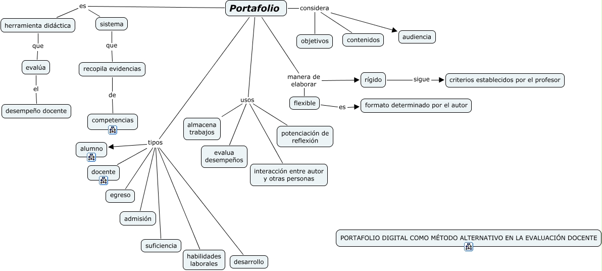 Este Cmap, tiene información relacionada con: Portafolio, Portafolio tipos docente, Portafolio considera objetivos, Portafolio es herramienta didáctica, Portafolio considera audiencia, Portafolio usos potenciación de reflexión, Portafolio manera de elaborar flexible, Portafolio tipos suficiencia, Portafolio usos evalua desempeños, rígido sigue criterios establecidos por el profesor, evalúa el desempeño docente, Portafolio tipos alumno, Portafolio manera de elaborar rígido, Portafolio usos almacena trabajos, Portafolio tipos egreso, sistema que recopila evidencias, Portafolio tipos habilidades laborales, Portafolio es sistema, Portafolio usos interacción entre autor y otras personas, Portafolio tipos desarrollo, Portafolio tipos admisión