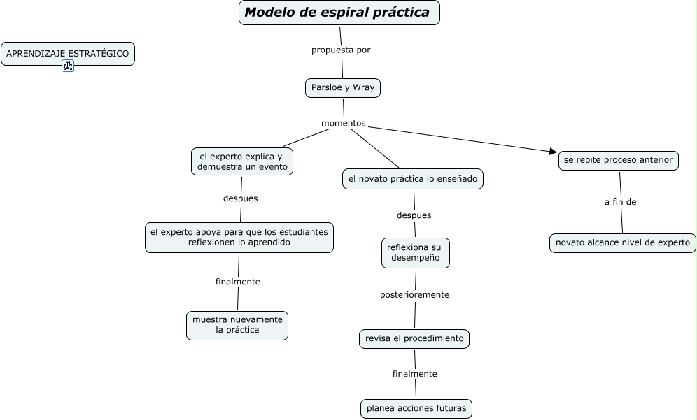Este Cmap, tiene información relacionada con: modelo de espiral práctica, Parsloe y Wray momentos se repite proceso anterior, se repite proceso anterior a fin de novato alcance nivel de experto, Parsloe y Wray momentos el novato práctica lo enseñado, reflexiona su desempeño posterioremente revisa el procedimiento, Parsloe y Wray momentos el experto explica y demuestra un evento, el experto apoya para que los estudiantes reflexionen lo aprendido finalmente muestra nuevamente la práctica, el novato práctica lo enseñado despues reflexiona su desempeño, el experto explica y demuestra un evento despues el experto apoya para que los estudiantes reflexionen lo aprendido, Modelo de espiral práctica propuesta por Parsloe y Wray, revisa el procedimiento finalmente planea acciones futuras