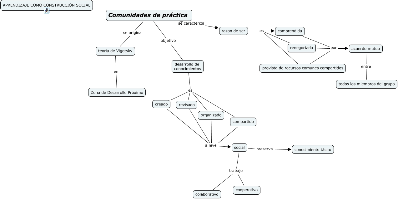 Este Cmap, tiene información relacionada con: comunidades de práctica, Comunidades de práctica se caracteriza razon de ser, teoria de Vigotsky en Zona de Desarrollo Próximo, Comunidades de práctica se origina teoria de Vigotsky, desarrollo de conocimientos es revisado, razon de ser es comprendida, desarrollo de conocimientos es creado, renegociada por acuerdo mutuo, desarrollo de conocimientos es organizado, organizado a nivel social, social trabajo colaborativo, creado a nivel social, comprendida por acuerdo mutuo, Comunidades de práctica objetivo desarrollo de conocimientos, acuerdo mutuo entre todos los miembros del grupo, compartido a nivel social, revisado a nivel social, social preserva conocimiento tácito, razon de ser es renegociada, social trabajo cooperativo, desarrollo de conocimientos es compartido