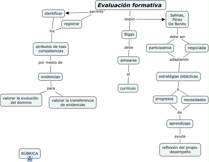 Este Cmap, tiene información relacionada con: evaluación formativa, evidencias para valorar la evolución del dominio, negociada adaptando estratégias didácticas, atributos de loas competencias por medio de evidencias, necesidades de aprendizaje, Evaluación formativa según Salinas, Pérez De Benito, participativa adaptando estratégias didácticas, Evaluación formativa permite identificar, evidencias para valorar la transferencia de evidencias, Evaluación formativa permite registrar, registrar los atributos de loas competencias, estratégias didácticas a progresos, identificar los atributos de loas competencias, aprendizaje ayuda reflexión del propio desempeño, Biggs debe alinearse, Salinas, Pérez De Benito debe ser negociada, Salinas, Pérez De Benito debe ser participativa, progresos de aprendizaje, estratégias didácticas a necesidades, alinearse al currículo, Evaluación formativa según Biggs