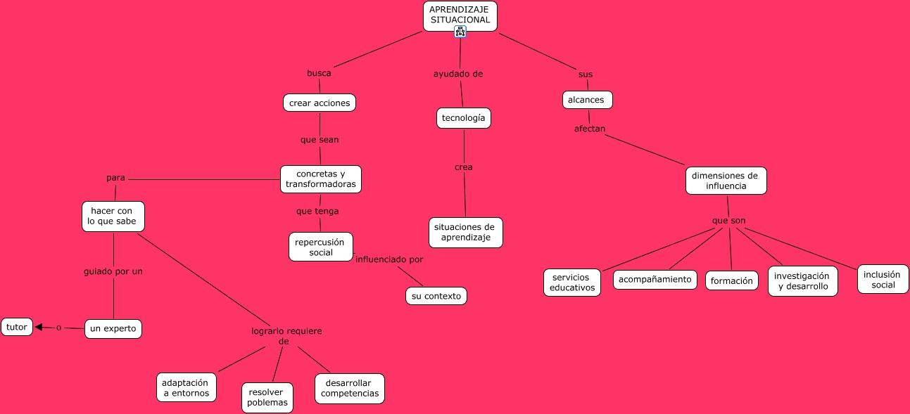 Este Cmap, tiene información relacionada con: APRENDIZAJE SITUACIONAL, APRENDIZAJE SITUACIONAL sus alcances, dimensiones de influencia que son inclusión social, dimensiones de influencia que son investigación y desarrollo, concretas y transformadoras que tenga repercusión social, tecnología crea situaciones de aprendizaje, crear acciones que sean concretas y transformadoras, hacer con lo que sabe lograrlo requiere de adaptación a entornos, hacer con lo que sabe lograrlo requiere de desarrollar competencias, hacer con lo que sabe lograrlo requiere de resolver poblemas, concretas y transformadoras para hacer con lo que sabe, dimensiones de influencia que son formación, hacer con lo que sabe guiado por un un experto, dimensiones de influencia que son servicios educativos, alcances afectan dimensiones de influencia, APRENDIZAJE SITUACIONAL ayudado de tecnología, un experto o tutor, dimensiones de influencia que son acompañamiento, APRENDIZAJE SITUACIONAL busca crear acciones, repercusión social influenciado por su contexto